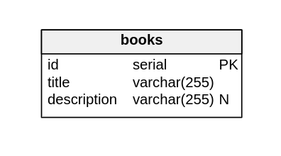 From figure 1, the table name is "books". It has 3 columns which are "id", "title", and "description". Each column has a type and column properties. For example, "id" column has a type of serial and PK indicates that it's a primary key of that table.